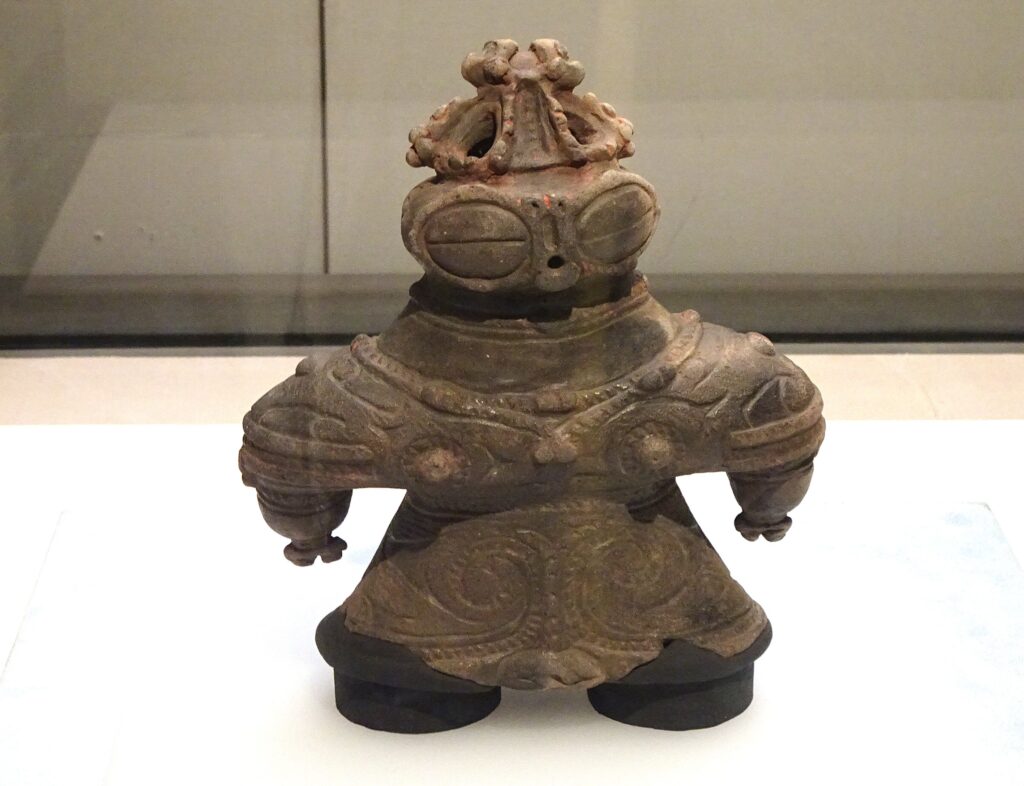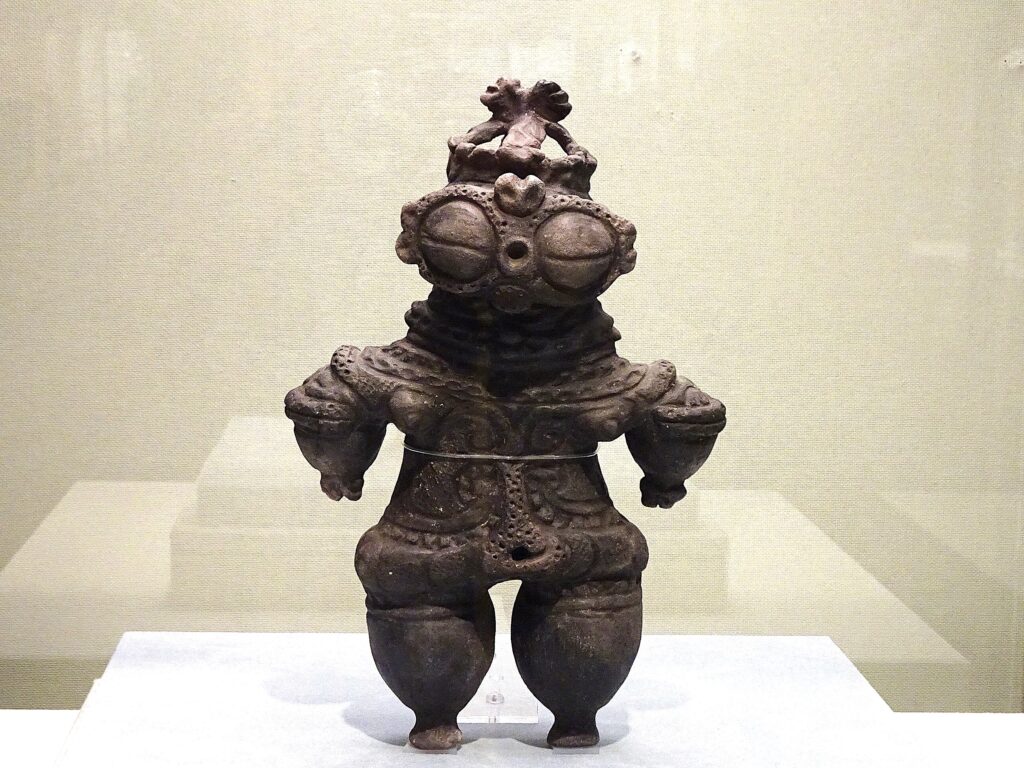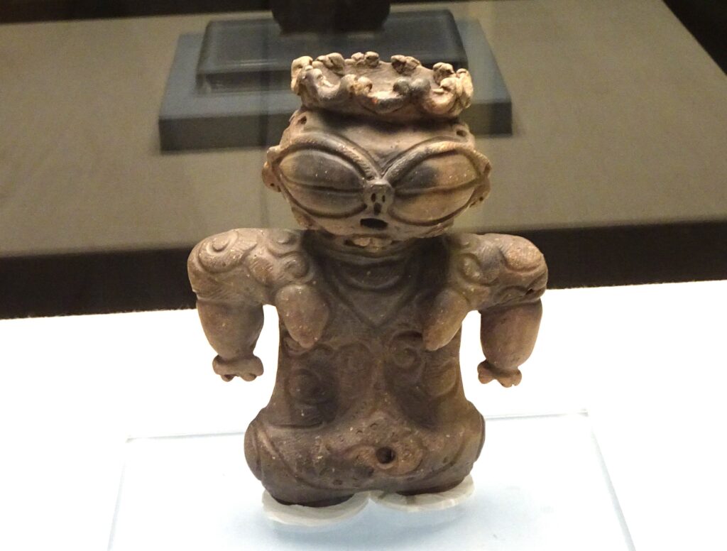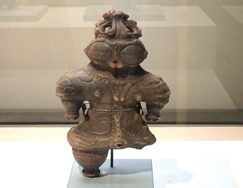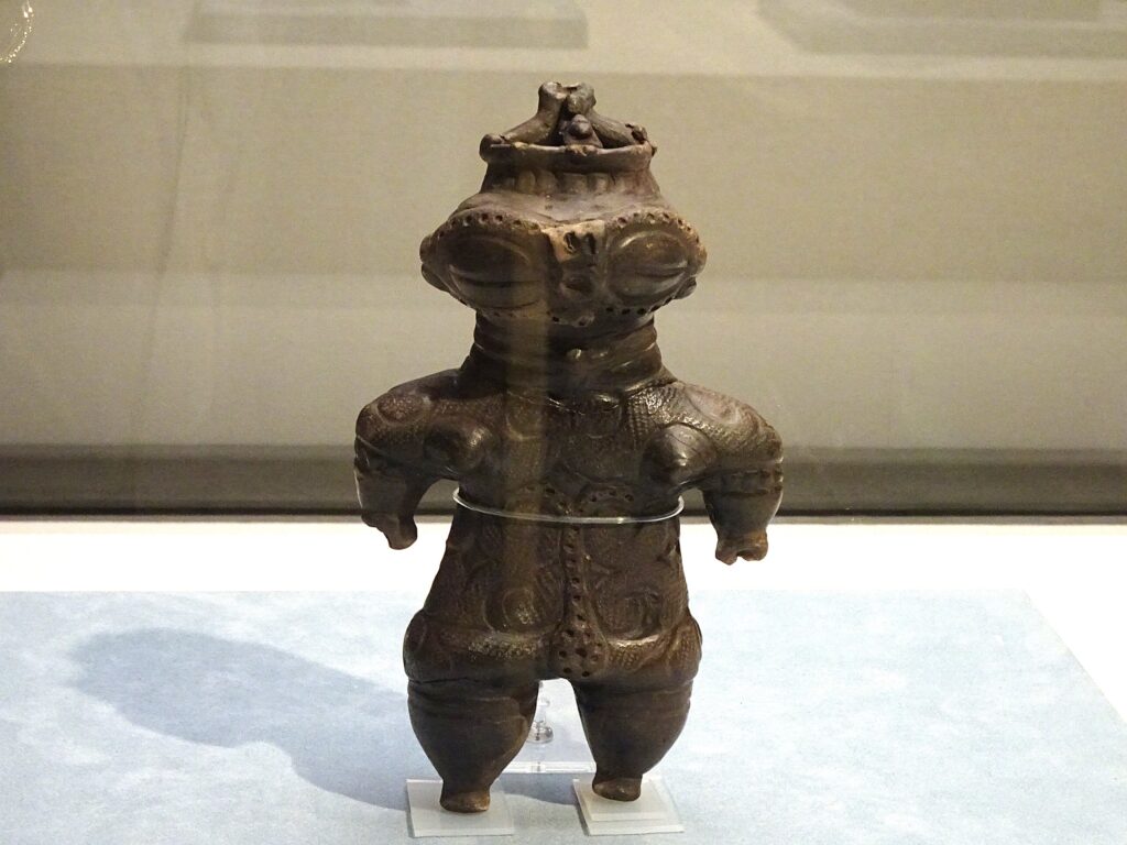 手代森遺跡(てしろもりいせき・岩手県盛岡市)、大形遮光器土偶 (おおがたしゃこうきどぐう) 重要文化財。大形言うても、身長31cm、体の幅19cm、厚さ9.5cm、体重は約1kg。捨て場から見つかったときはバラバラだった破片をつなぎ合わせて、大きく立派な土偶に。まさに、どっグ~やん。体の中は空。頭や胴の一部にちょっとだけ残る朱(ベンガラ)は、はじめは全身に塗られていたと推測。大形版が完全に近い形に復元されるんは珍しい言うことで、国の重要文化財。