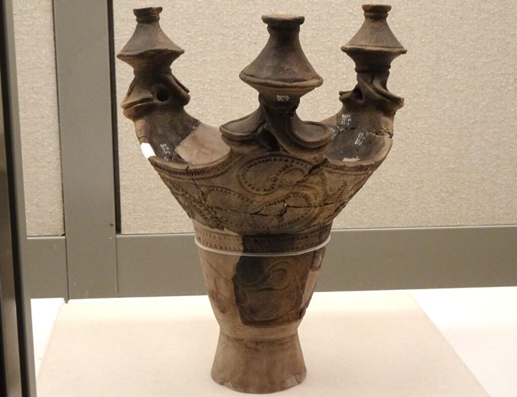 装飾突起をもつ台付深鉢形土器(秋田県鹿角市)。大湯環状列石(おおゆかんじょうれっせき)から出土。いわゆるストーンサークルやね。祭祀や集会の場、墓地、あるいは太陽や月の運行を示す暦の役割などがあったとか。ここのは全国的に標準的なストーンサークルモデルで有名みたい。ってあんまし理解できてないけど、ストーンサークルは西原無量が活躍する発掘ミステリー本で見たよーな気がする。そーいえば、キリストの土偶を探してたなぁ・・って、フィクションだっせ、へへへっ。。けどなんか、ロマンやなぁ。