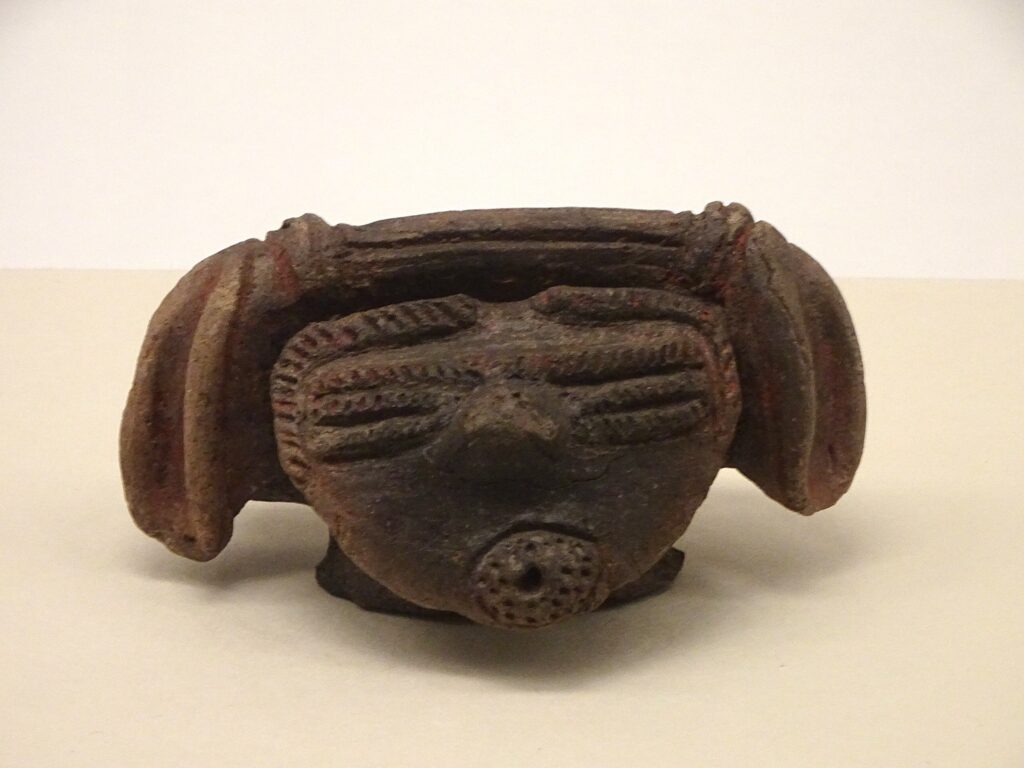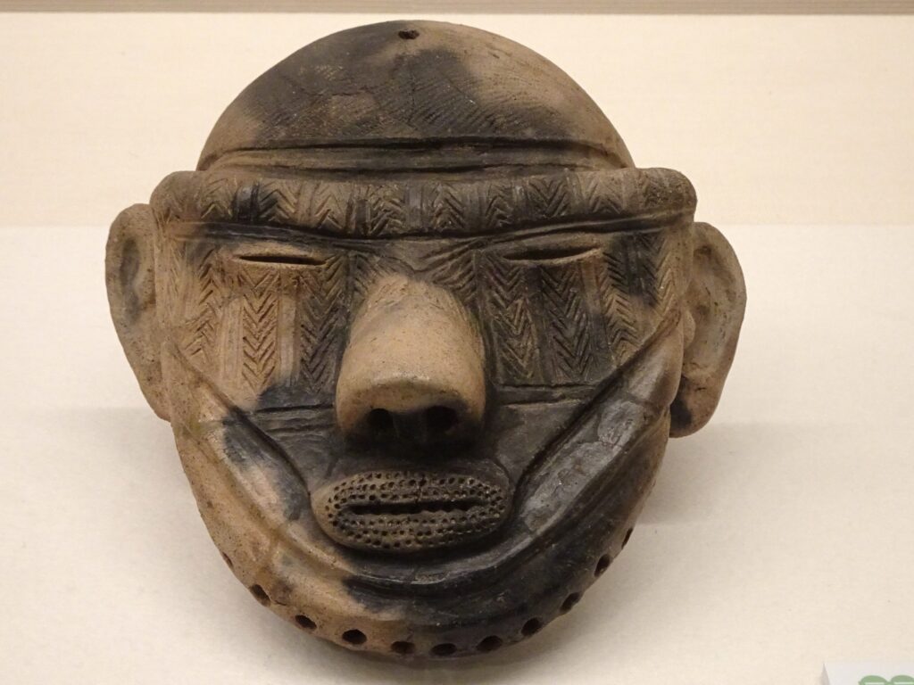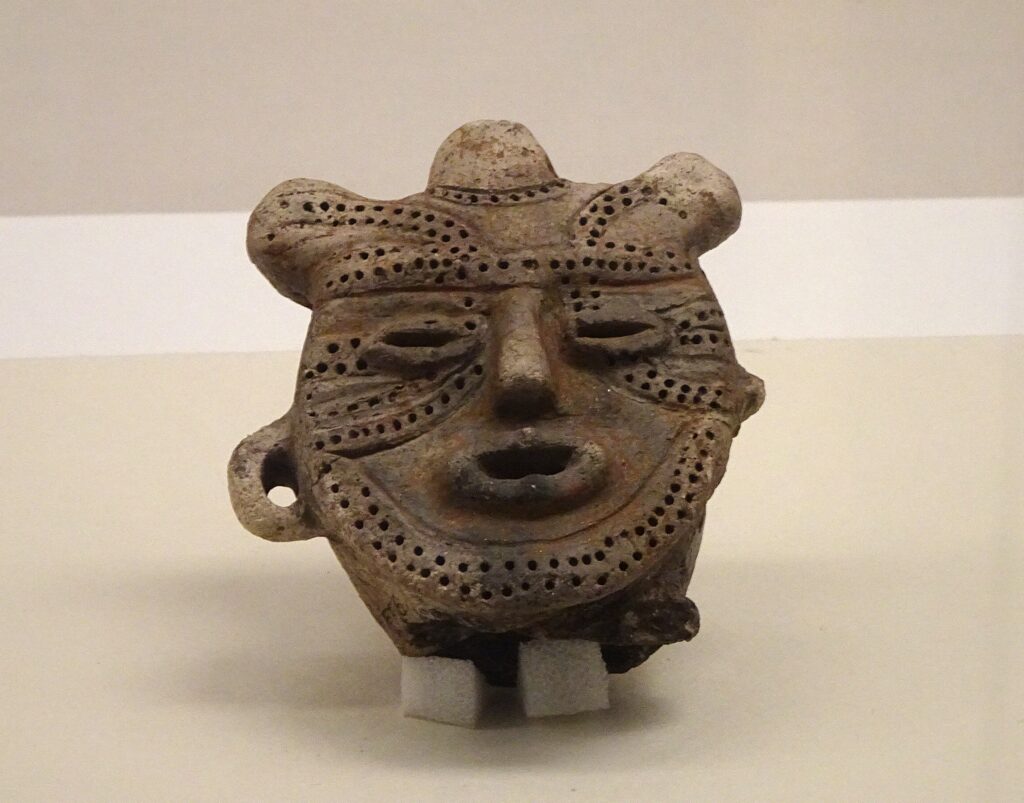 根岸遺跡(宮城県大崎市)、入れ墨のある土偶。顔の小さな孔が入れ墨の表現。耳の輪っかは耳飾り。