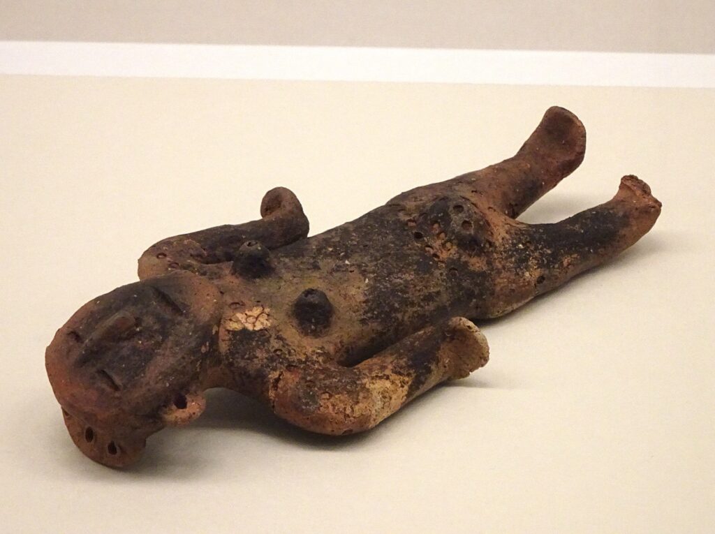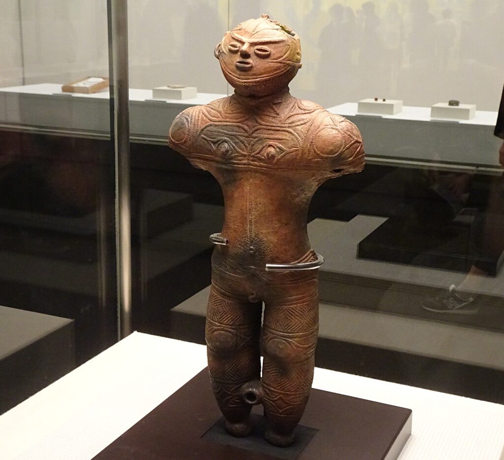 星宮遺跡(ほしみやいせき・秋田県大仙市)、遮光器土偶。片脚が欠けてる。