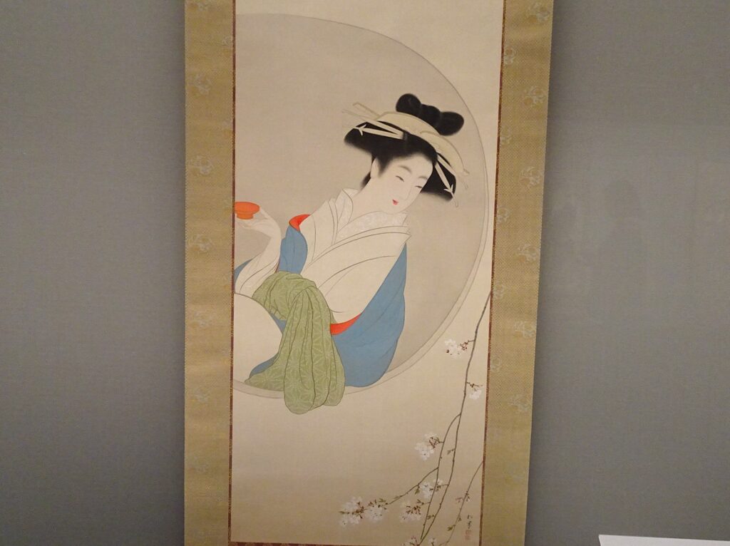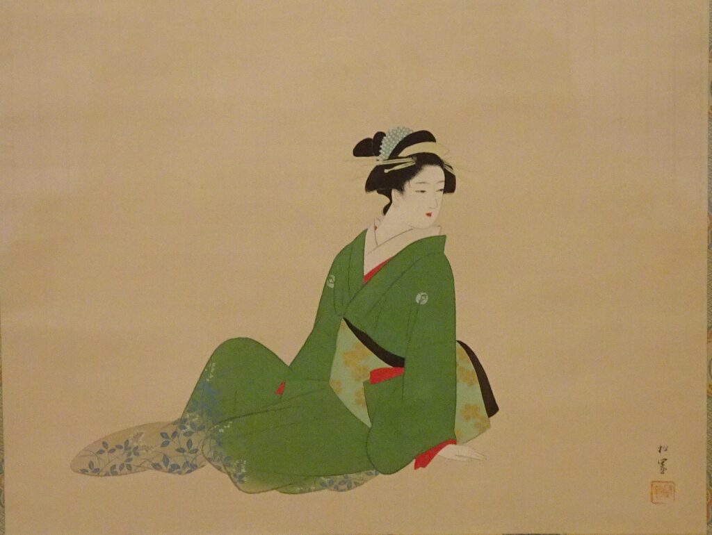 上村松園〈春風〉1936年頃。光の加減で見にくいけど、おねぇさんは左下の蝶々を見て、春やなぁと。こういうの近代日本画に多いよね。一見、ホコリなら払わんとと思うけど、目を凝らしたら昆虫や小さな生き物がものスゴち密に描かれてて、なにげに重要ポジション。水色の着物に赤の帯、松園の好きな組み合わせ。よー見る。