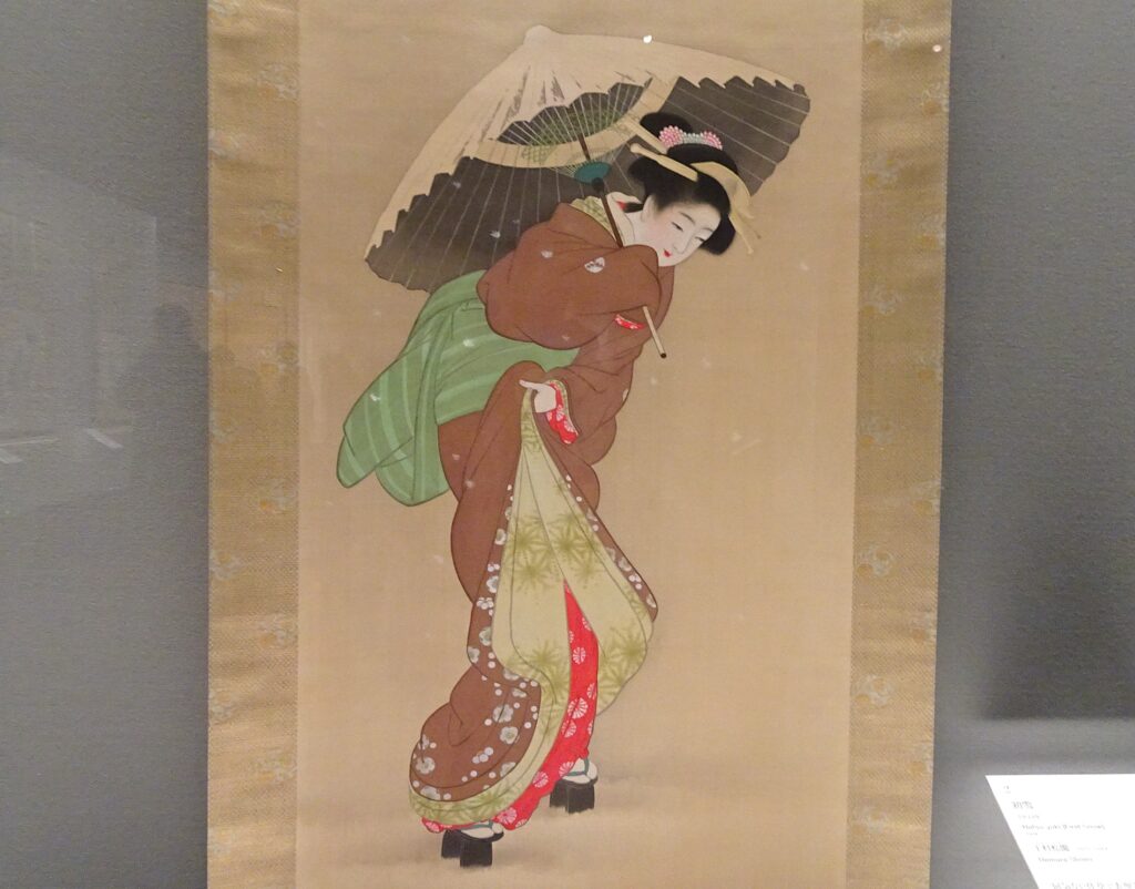 上村松園(うえむらしょうえん、1875ー1949)〈初雪〉1939年頃。着飾ってお仕事に向かうおねぇさん、予期せぬ雪が難儀な様子。襦袢の赤がオシャレ。着物で手をくるんでちょっとでも暖こうして傘をさす。京都嵐山・福田美術館「上村松園と美人画の軌跡」展。嵐山は混雑やなぁ思たけど、生誕150周年の松園、充実の福田美コレクション久しぶりに観たくて。嵐電、始発の四条大宮で座ったら終点の嵐山まで何があっても無視を決め込む。言うても今や、席を譲ってもらう高齢者。