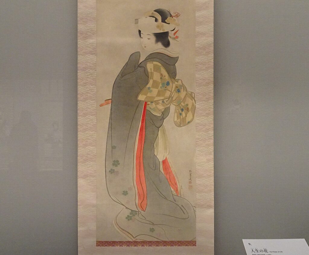 上村松園「人生の花」1902年頃。このお題のは京セラ美にもあって、婚礼の式場へと向かう花嫁とその母親の姿が描かれてる。福田美のは不安と期待が混じる表情の花嫁だけ。白無垢やなくて明治時代の流行りらしい黒引き振袖が、光の加減で薄淡く見えてるのもまた、不安な花嫁の心なのかしら。