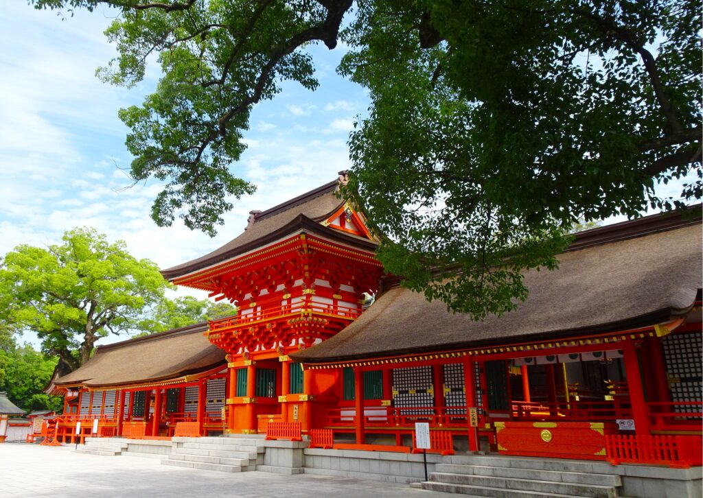大分県・宇佐神宮。国宝の本殿。朱色に青空と新緑ショットも、いよいよ大詰め。
