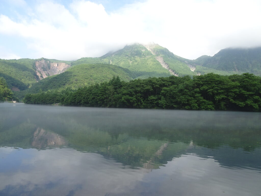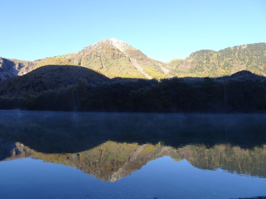 焼岳もすっきり。今回は噴煙見えんかった。秋は朝早やと半分、影。大正池に映る姿もおもしろい。突然やけど、夏上高地と比較してみようコーナー。今年の夏の焼岳っス。夏のブログ発してへんし、ちょーど良かった。