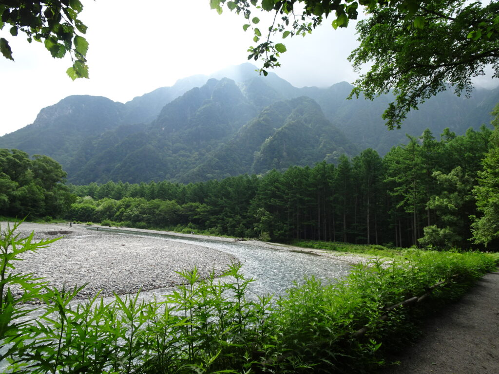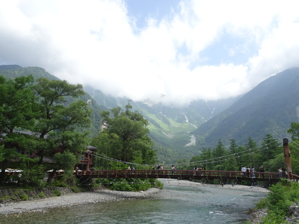 穂高連峰ビュー。安定の快晴。早すぎてカフェ開いてへんので、持参のチョコケーキとお湯でいっぷく。安あがり。ダウンジャケやけどウォーク用で中は長Tシャツ程度やし、長居は無用。10時発のバスで上高地にバイバイ。もはやただの朝ウォーク。早朝の京都八坂神社ウォークと変わらへんけど、この生活リズムがカラダにおうてるよーや。夏の河童橋は・・
