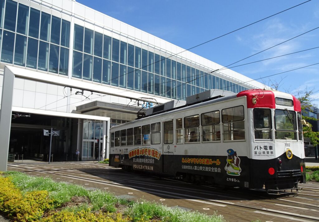 お城から富山駅まで路面電車を見ながらウォーク。まだ暑い。おっと、富山駅へ入っていくパト電、見っけ。京都の嵐電でも走ってたよね。実は去年の富山旅で見つけてて、2023年から1年間の運用らしかったのに、がんばってはるやん。さすが鉄道王国・富山。JR富山駅内にある路面電車のフラットなホームは、いつ見てもオシャレやなぁ~。ついつい乗りたなるけど、まずはホームをそのまま抜けて北側へウォーク。