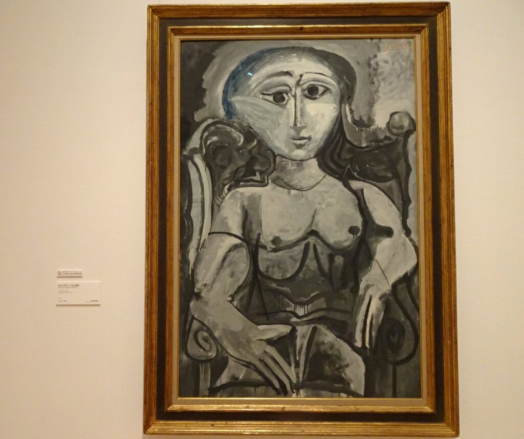 パブロ・ピカソ≪肘かけ椅子に坐る裸婦≫1964年。4年の変化?目はやっぱズレてるけど。この構図、別のをカラーバージョンで見た気がする。男子が描かれてたよーな。まっ、構図は似るか。モネさんなんか、ずーっとおんなじよーな睡蓮、描いてはるもんね。