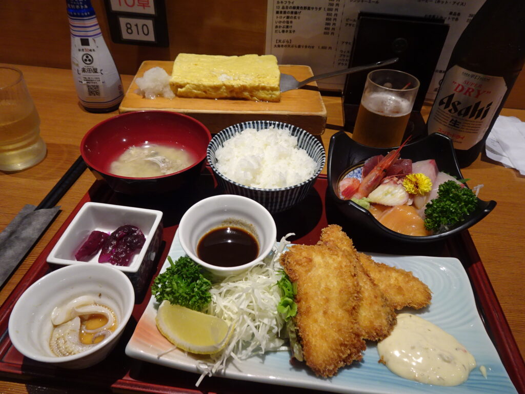 高岡駅前「北前そば 高田屋」魚フライ&刺身定+だし巻き。行列の富山ブラックのラーメン屋を横目に、すぐにビールでのどを潤せる店へ。カウンター席の隣では高齢男子がソバに熱燗。幸せ~~、をいつでもどこでも味わえるよーに、富山から高岡へは鉄道で来たんスよ。高岡からはJR氷見線やJR城端線に乗り継げるんで、今回も迷たんやけど、また今度に取っとくことにしました。次回旅へのワクワク気分。幸せ~なお土産。