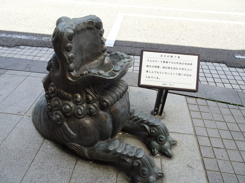 商店街のモニュメント、水のみ獅子像。獅子も私も、のど、カラカラ。