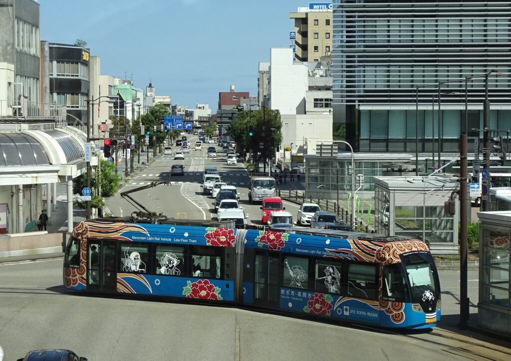 万葉線トラム。高岡にも、低床車両のこんなかわいいラッピング路面電車あんねんから乗ったらえぇんやけど、金屋町から高岡駅までドーンとまっすぐな道、やっぱ歩いちゃいました。道があったら歩く、普通やん。なんか変?駅まで2㎞弱。さらにヘロヘロ。