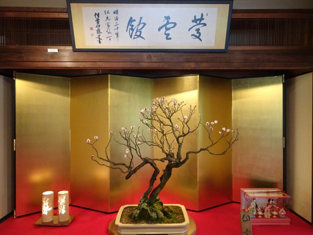 中に入ると、金屏風バックにどーんと盆梅。これも花少なめやけど、盆梅は枝ぶりも楽し。