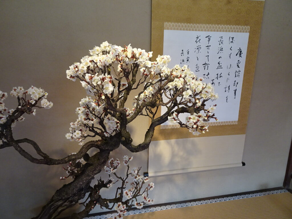 早いのか遅いのか、会場・慶雲館(けいうんかん)入り口のしだれ紅梅は、花、ポツポツ。3月10日までやから・・。