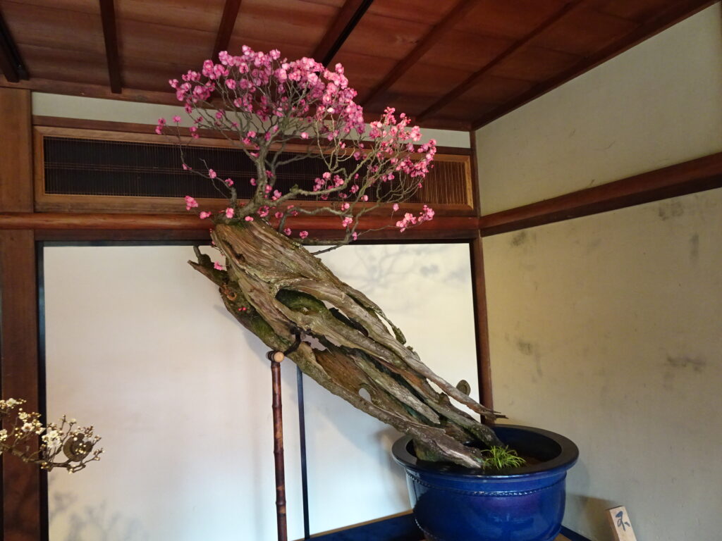 樹齢400年。最高齢の盆梅「不老(ふろう)」。たぶん今が旬やろけど、老けたなぁ。5年前の2021年3月にメインビジュアルでブログ紹介してるんで、なんならご覧ください。ついでに、2023年にも盆梅展ブログあります。この時はブルー琵琶湖にメインの座を奪われて。。それでも「不老」はまだ「不老」然(ぜん)としてた。がんばれ!