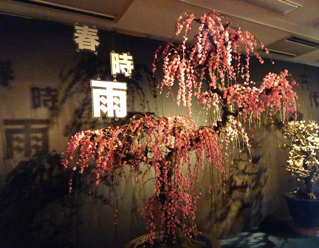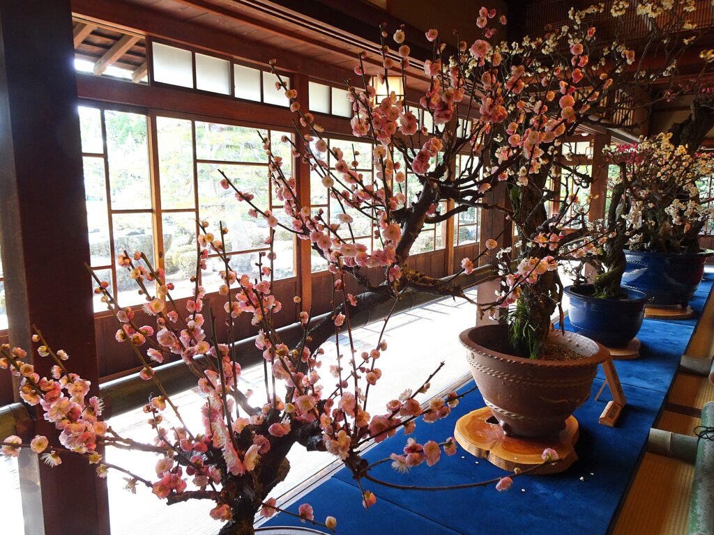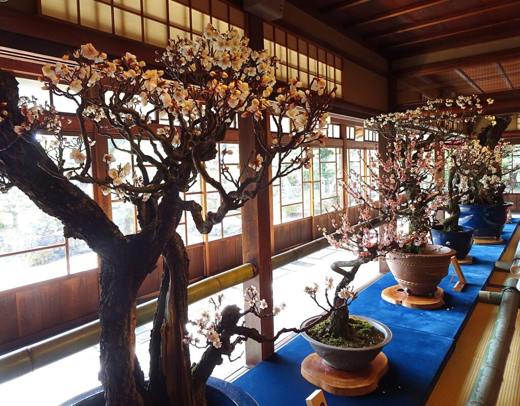 期間中、趣ある枝とお花が楽しめるよーに、一年をかけてお手入れされた盆梅たち。