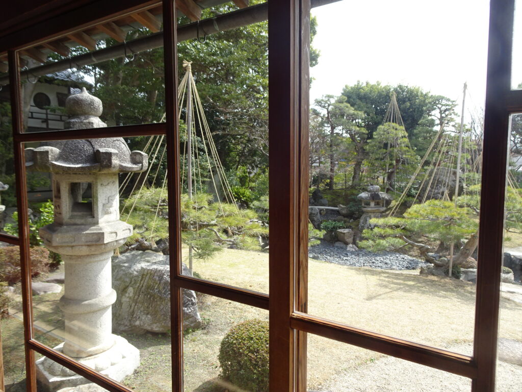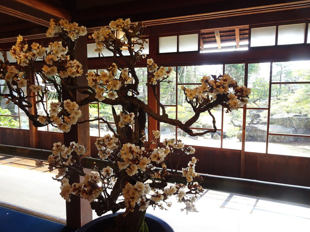 盆梅の向こう、ガラス越しに風情あるお庭が見える。七代目小川治兵衛の作庭いうといたら、だいたい当たる。ここ長浜やけど。いやほんまに、治兵衛はんどすえ。長浜まで出張しはってん。なんせ長浜は秀吉はんやし・・時代が違うか。ハハッ。