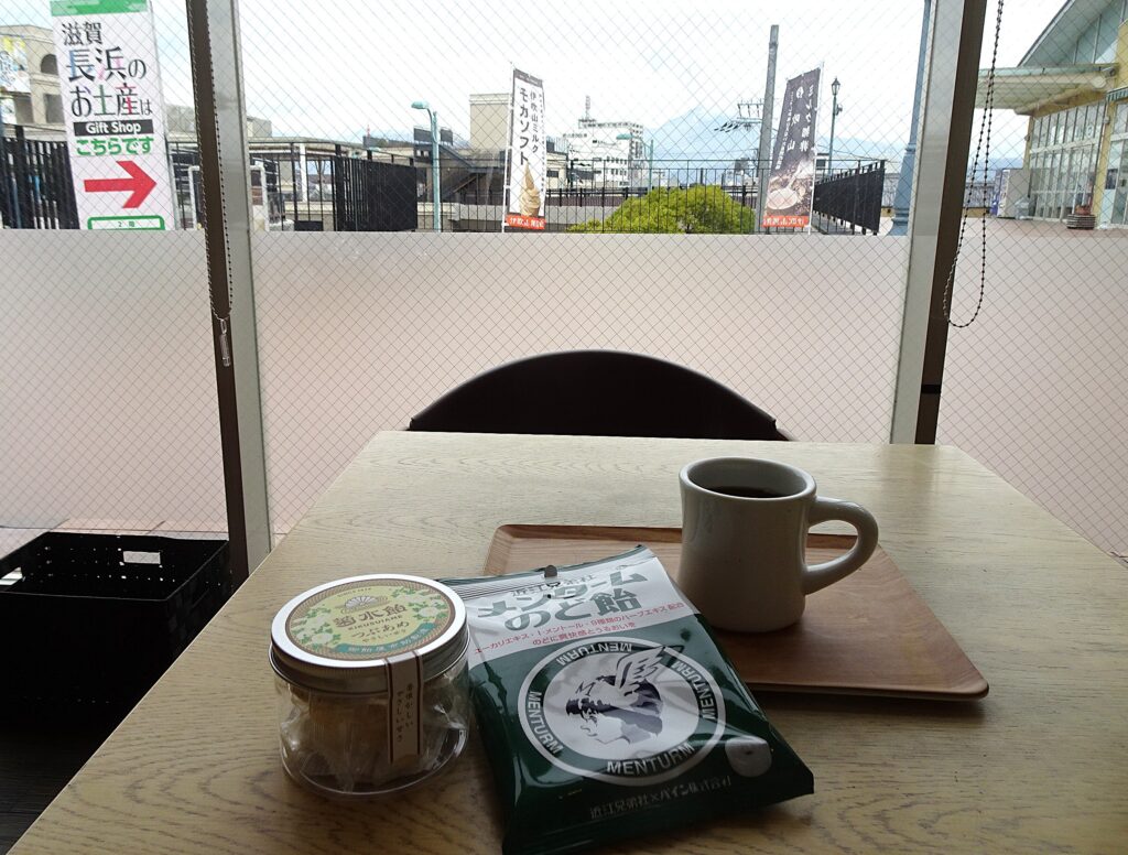 長浜駅横の「伊吹山珈琲店」で列車待ちのいっぷく。これもだいたい恒例。正面に伊吹山が見えるし空いてるんで。おみやげにメンタームのど飴買うてみた。近江八幡の近江兄弟社やね。飴ちゃん自体は、大阪のパインアメ屋がつくってはるらし。形はパインアメやけど、スースーする。おもろい。まっ、こんなん見つけるんも楽し。西川王国のお菓子もあった。平和堂やしね。次回の滋賀旅で試してみよう。3月、梅はあちこち見頃なってきた。