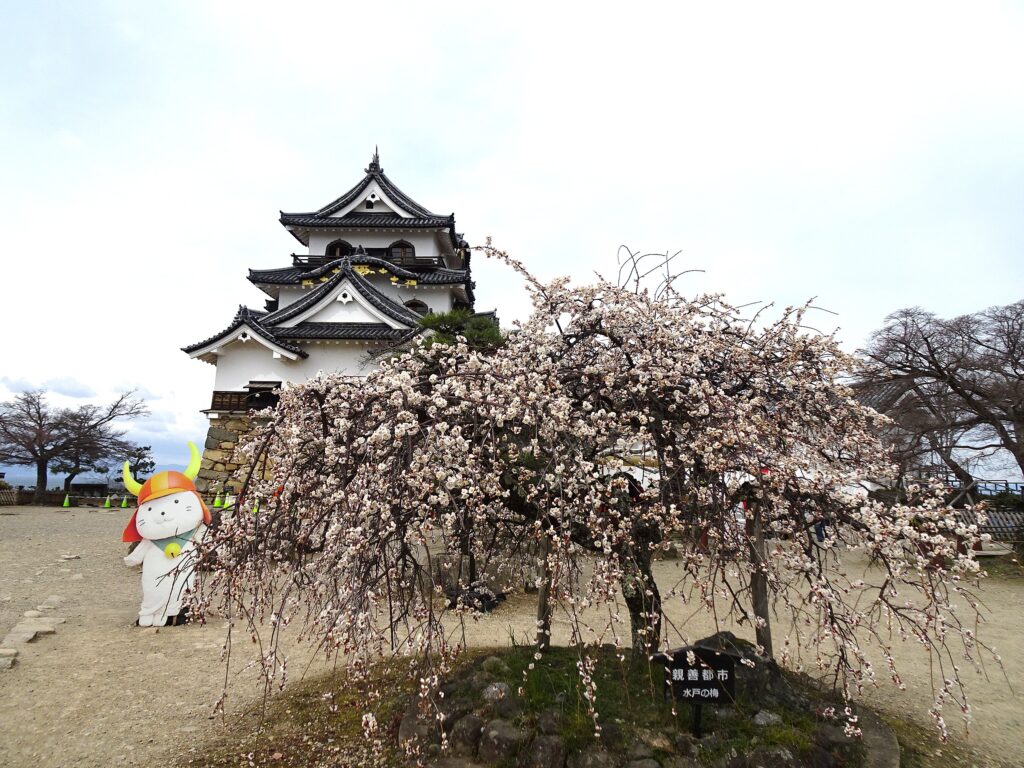 ひこにゃんパネルとのショット。水戸から贈られたて書いてある、しだれ梅。ちょっと窮屈な写真なのは、天守前の工事機材を隠すため。紅葉終了からサクラの開花までは、どことも庭師や土木屋さんがメンテ中。滋賀旅3部作もすべてそうやった。ユンボやコーンを巧みに隠すワザ、どう?