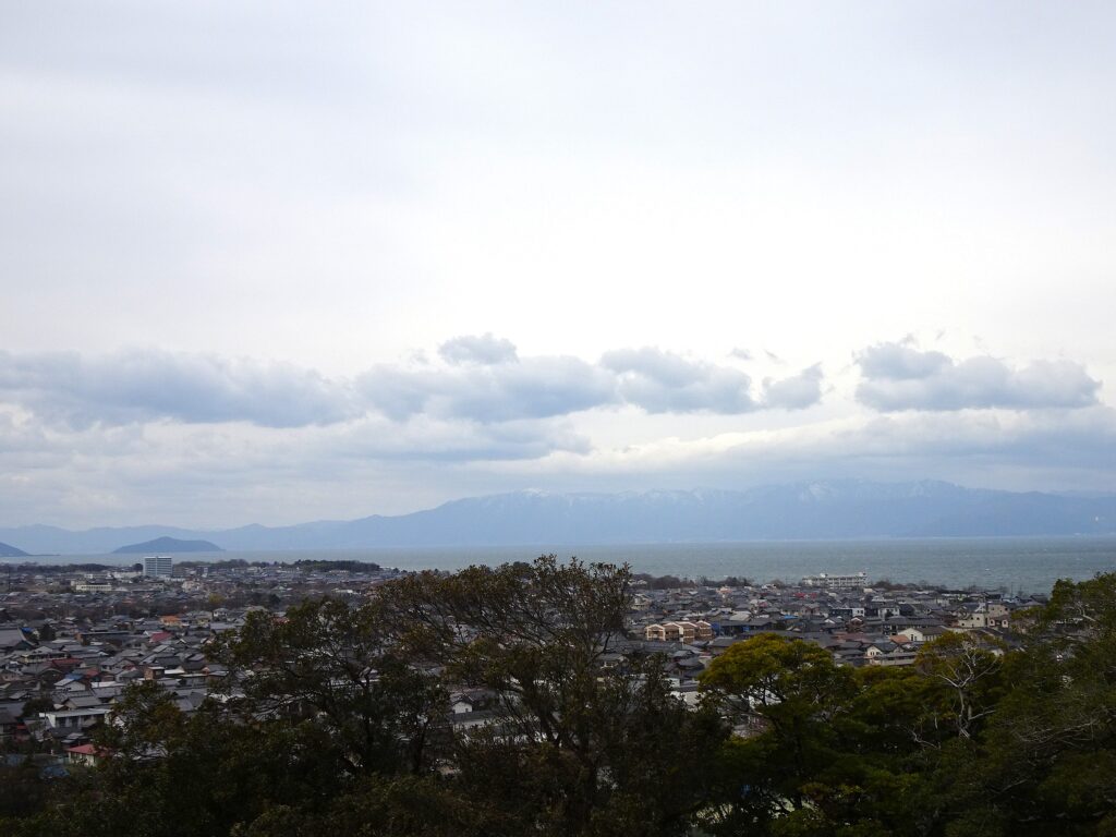 彦根城からの琵琶湖ビュー。この日は西から強風。琵琶湖もグレー。西の山々には時々じぐれ雲。サンダーバードは湖西線走れず東海道線回り。そう、この日もまた米原のホテル泊。車を置いて米原からJRひと駅の彦根へと改札入ったらそんなアナウンスしてはった。東海道線混雑。これ以上増えたら列車ぶつかるえー。