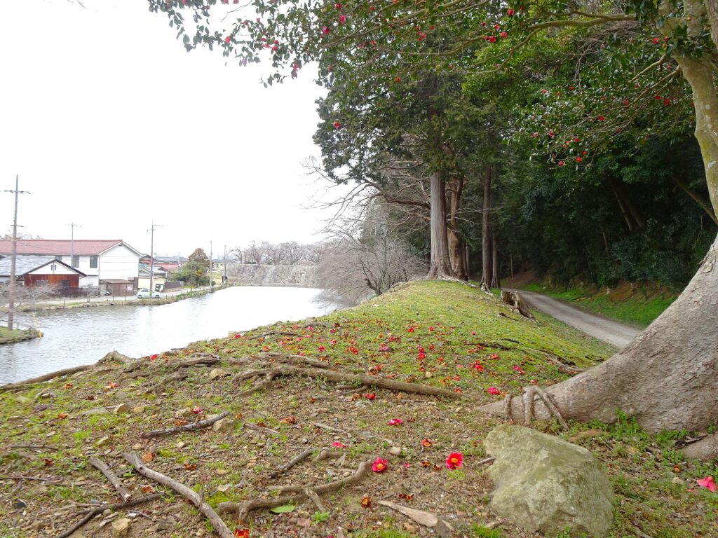 ほぼ人が歩かへん堀横の道。ここ好きやねん。落ち椿・・京都の城南宮ってわけにはいかんけど、侘び寂びの風景。奥の枯れ木はサクラ。もうちょっとしたら咲かはるえー。