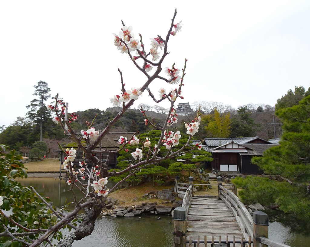 名勝・玄宮園(げんきゅうえん)。梅と天守のコラボショット。彦根城セット1000円のお庭。江戸時代前期の池泉回遊式庭園やし、とても・・新し。