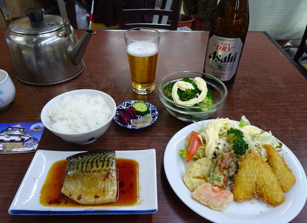 ランチは地元御用達「はやの食堂」。前回オムライス食べたとこ。ショーケースにお惣菜が並んでて、サバの煮つけとフライ盛取ったらオムライスは無理が確定したんで、ブロッコリーと白ご飯にしてみた。前回も食べたけど、このサバ、どーやって煮るんやろ。とろ~っと甘い煮汁やねん。最後ご飯にかけたいとこやけどちょい恥ずかしんで、小刻みにバウンドさせて煮汁ご飯。おかわりしたいくらい。ビール飲んだしかろうじて思いとどまる。営業してはるんやろか心配なる外観やけど、ひとり女子も多いしえぇ食堂やわ。今回、宿泊の予約サイト間違えて1000円割高。気ぃ付いたら返金不可。あっちゃー。近江牛がサバになったっちゅうことで。・・いやいや、追加1000円払ろてでも食べる価値あるサバやし。