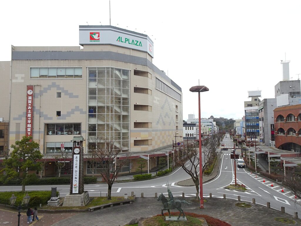 JR彦根駅からの景色。手前に井伊さん馬に乗ってはる。アル・プラザ彦根の最上階に本屋と眺めのえぇカフェ見っけ。次回はぜひ利用しよう。楽しみ。