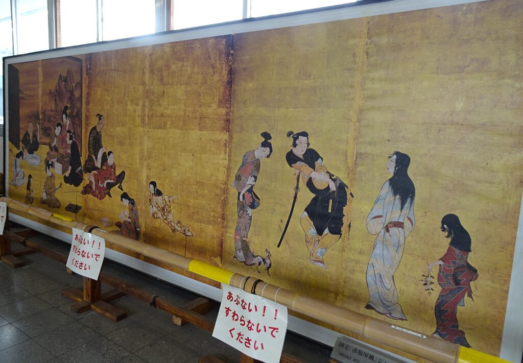 彦根駅の2階通路、国宝・彦根屏風のデッカイプリント。彦根城博物館の本もの、次はいつ公開しはんのやろ。JR線、強風の遅れ少々あったものの無事米原着。運休してたら6㎞強を歩かんとアカンかな思た。列車も旅のアトラクション。ホテルで持参の本を読みふける。日常とは違う感が好き。翌朝は超すっきり青空やけど強風はおさまらず。紺碧(こんぺき)ブルーな琵琶湖に、1m越えの白波が立つ景色を見ながら大津まで湖岸道路ドライブ。小さくても旅は楽し。
