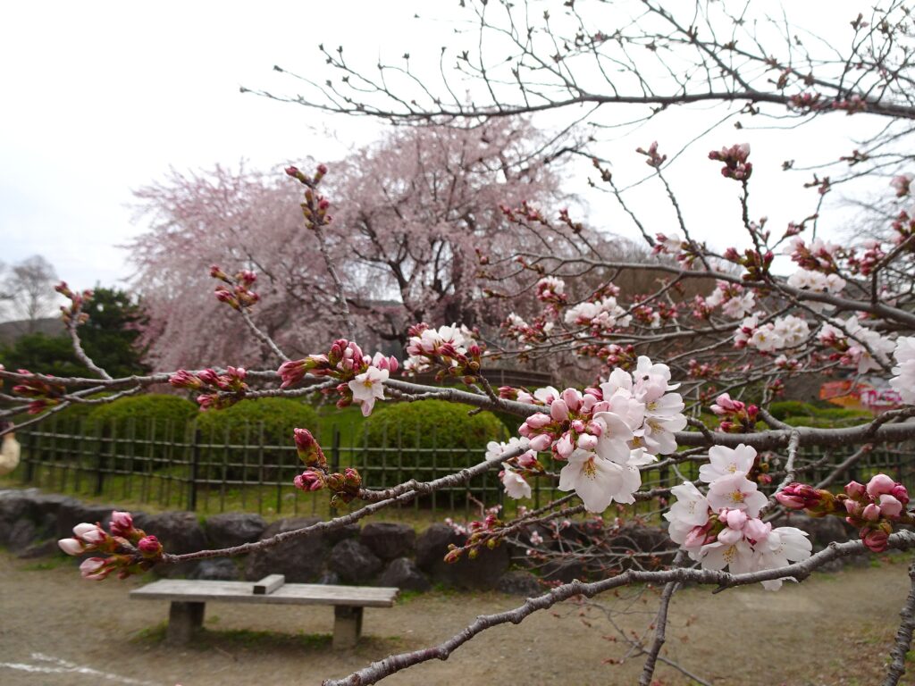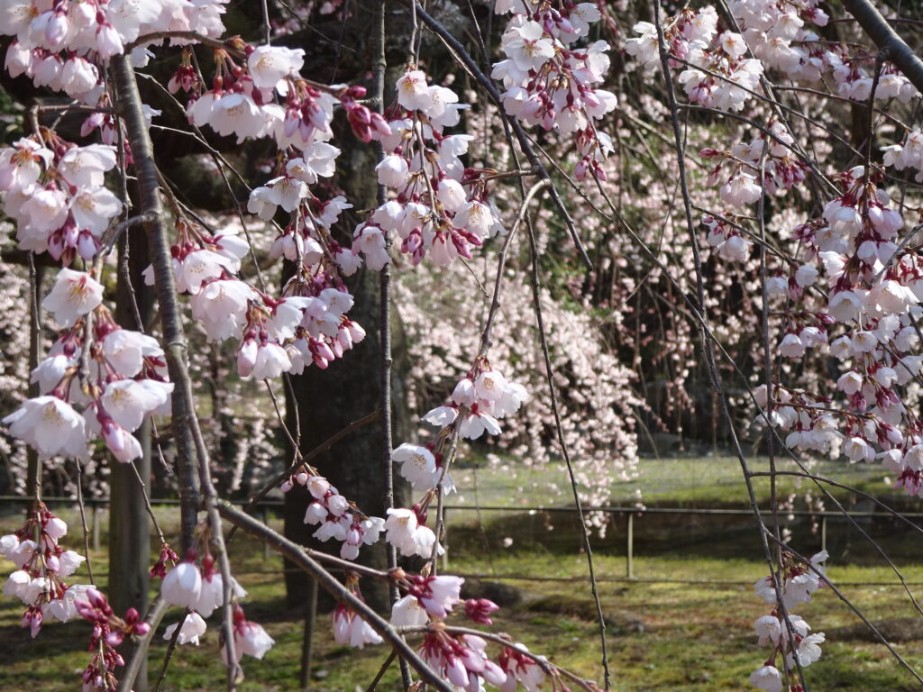 御所桜とまわりの桜いろいろもほぼ満開。御所桜となりの紅しだれ・斎王桜(さいおうざくら)はまだでした。