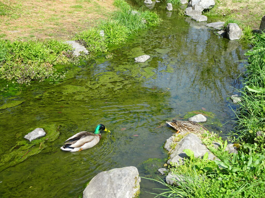 「出水の小川」のカモたち。スイスイスイスイ餌さがし。水ぬるむ季節。