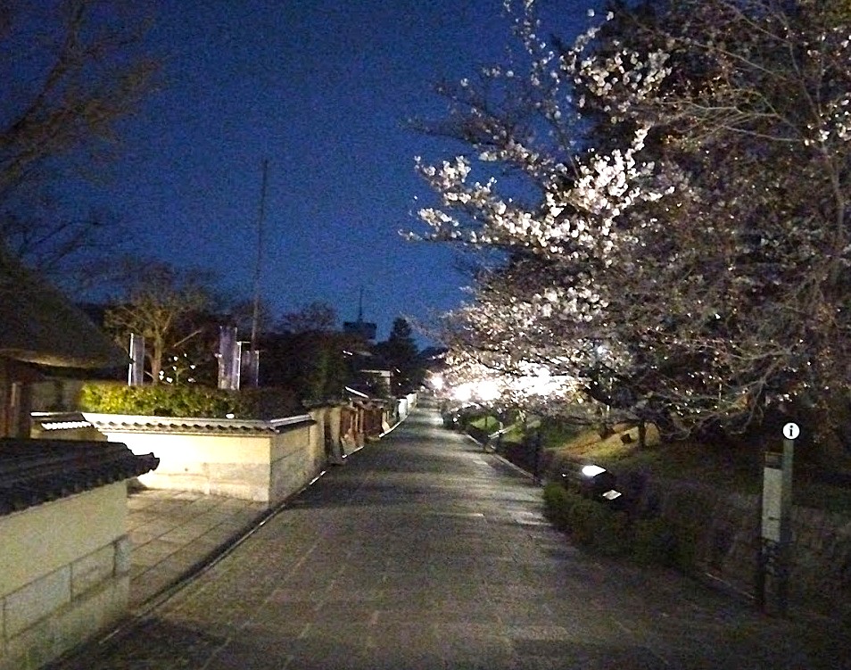 さかのぼって早朝ウォーク、高台寺前の「ねねの道」。ちょいぼーっとしてるソメイヨシノでゴメンやけど、人いないバージョンは暗がりやないと撮れへん。